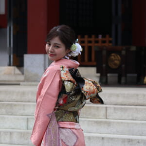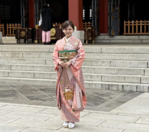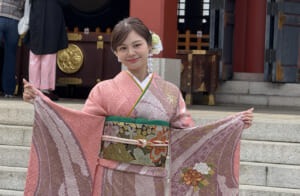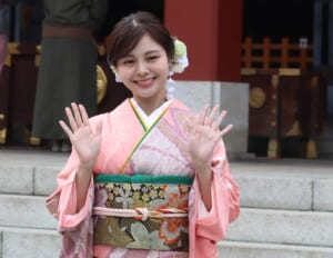 日枝神社に報道陣の前に姿を現した本間日陽さん。艶やかなピンクの振袖を披露。